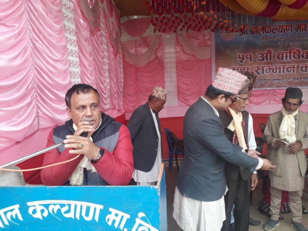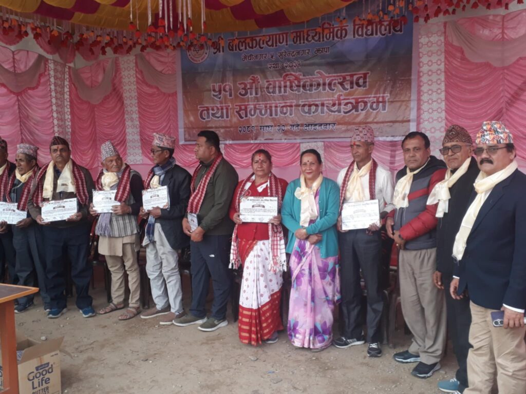 मेचीनगर । मेचीनगर –५ स्थित बालकल्याण माध्यमिक विद्यालयले आइतबार ५१ औं वार्षिक उत्सवको अवसर पारेर विद्यालयका उत्कृष्ट अभिभावक, उत्कृष्ट शिक्षक, पूर्व शिक्षक, पूर्व कर्मचारी र अक्षयकोष दाताहरुलाई सम्मान गरेको छ ।