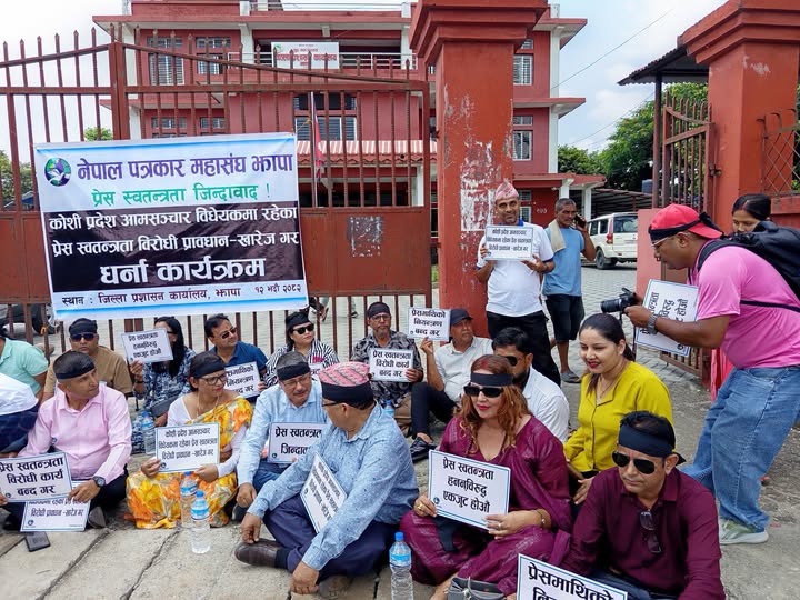 झापा । कोशी प्रदेश सरकारले ल्याएको आम सञ्चार विधेयक सच्याउन माग गर्दै आन्दोलनमा उत्रिएका पत्रकारहरुले आज जिल्ला प्रशासन कार्यालयमा धर्ना दिएका छन् ।