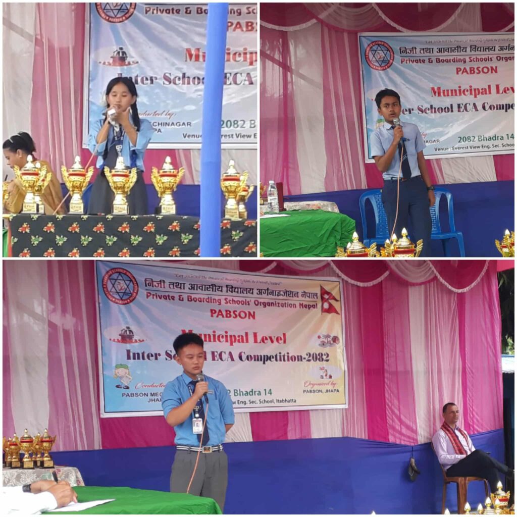 प्याब्सन मेचीनगर अध्यक्ष विक्रम क्षेत्रीको सभापतित्वमा सम्पन्न कार्यक्रममा मेचीनगर – ८ का वडाध्यक्ष गिरीराज धमला प्रमुख अतिथि थिए । प्रतियोगिताको सबै विद्यामा उत्कृष्ट घोषित भएका छात्र छात्रा तथा विद्यालयहरुलाई पुरस्कृत गरिएको एभरेष्ट भ्यू आंग्रेजी माविका कोअर्डिनेटर तथा इसिए कार्यक्रमका संयोजक रुपसागर अधिकारीले जानकारी दिए । प्रतियोगितामा सहभागि मध्ये हाजिरी जवाफ प्रतियोगिता, वक्तित्वकला र कविता वचनमा प्रथम स्थान हासिल गरेका विद्यालयहरु भने भदौ अन्तिम साता हुने जिल्ला स्तरीय प्रतियोगितामा सहभागि हुन पाउने उनले जानकारी दिए ।