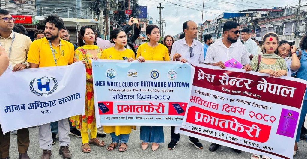 विर्तामोडस्थित हनुमान कम्प्लेक्स अघिबाट प्रेस स्वतन्त्रता जिन्दवाद, संविधान दिवस जिन्दावाद, संविधानको रक्षा गर, भ्रष्टचारको अन्त्य, सुशासन र शान्ति हाम्रो चाहना, सुशासन कायम होस जस्ता नारा लेखिएका प्ले— कार्ड र आ— आफ्नो संस्थाको पहिचान झल्किने व्यानरसहित सहभागीहरुले विर्तामोड बजारको परिक्रमा पछि मुक्ति चोकमा पुगेर कोण सभामा परिणत भएको थियो ।