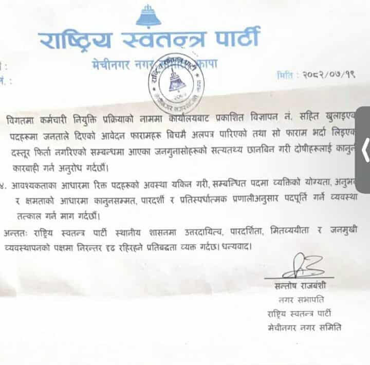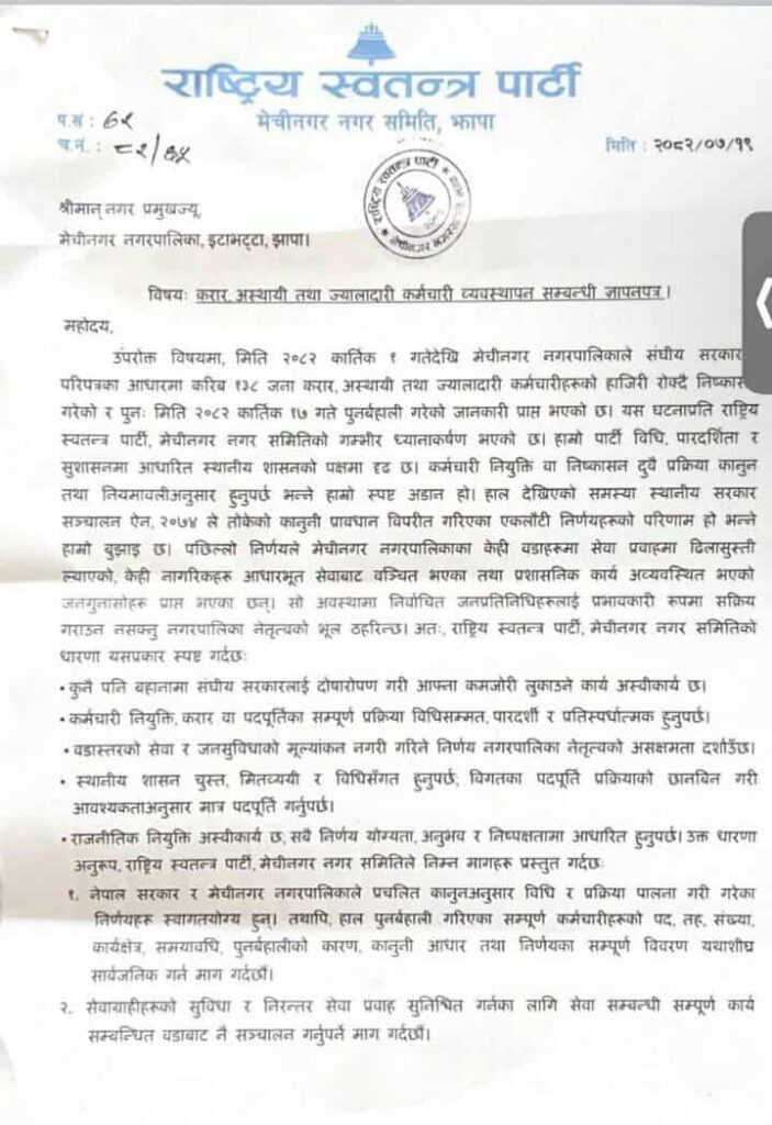 संघीय सरकारको परिपत्रका आधारमा मिति २०८२ कार्तिक १ गतेदेखि मेचीनगर नगरपालिकाले हटाएका १३८ जना करार, अस्थायी तथा ज्यालादारी कर्मचारीहरूलाई पुनः नगरपालिकाले मिति २०८२ कार्तिक १७ गते पुनर्बहाली गरेको विषय प्रति गम्भीर असहमति जनाउँदै रास्वपाले नगरपालिकामा ध्यानाकर्षण पत्र बुझाएको हो ।