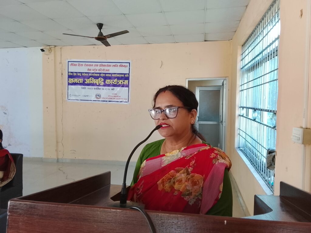 सहभागिहरुलाई लैंगिक हिंसा प्रतिकार्य विज्ञ उप्रेतीले लैगिक हिंसा न्यूनीकरणको लागि खेल्नु पर्ने भूमिका, लैंगिक हिंसा सम्बन्धी एकीकृत परियोजनाको परिचय तथा आगामी कार्यक्रमको बारेमा जानकारी दिनु भएको थियो ।