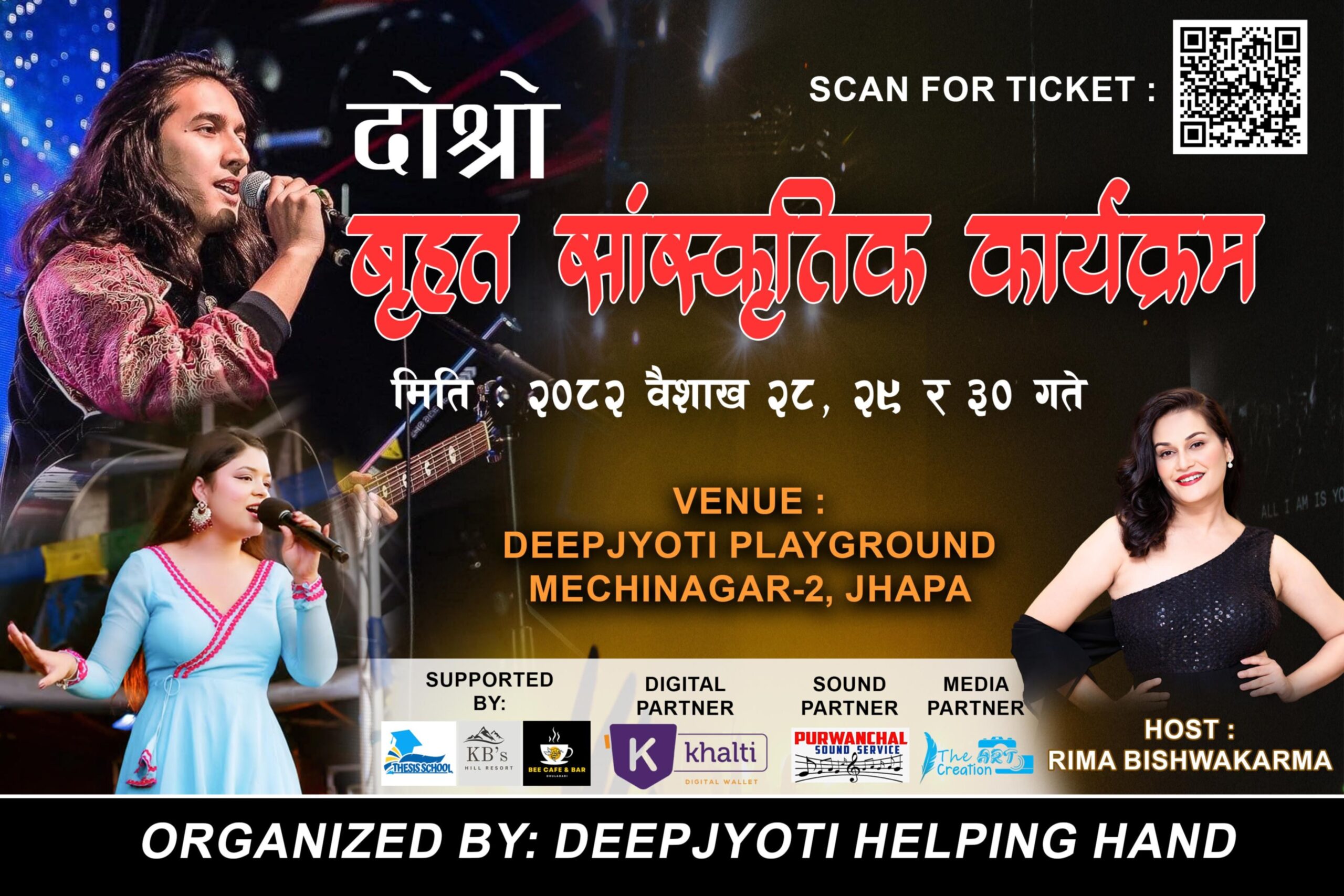 मेचीनगर । झापाको मेचीनगर –२ स्थित दिपज्योती खेलमैदानमा यही बैशाख २८ गतेदेखि ३० गतेसम्म दोस्रो बृहत साँस्कृतिक कार्यक्रम आयोजना हुने भएको छ । दिपज्योती हेल्पिङ हेण्को आयोजनामा हुन लागेको कार्यक्रममा ख्यातीप्राप्त राष्ट्रिय तथा स्थानीय कलाकारहरुको बेजोड प्रस्तुती रहने छ भने मेचीनगर क्षेत्रमा रहेका १० वटा बिभिन्न विद्यालयहरुले समेत आफ्नो क्षमता प्रस्तुत गर्ने छन् । लागू […]
