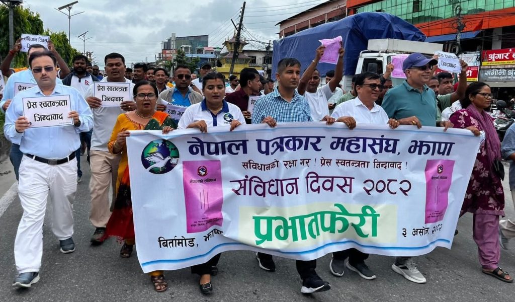 १० औं संविधान दिवस : नेपाल पत्रकार महासंघको अगुवाइमा विर्तामोडमा प्रभातफेरी र कोणसभा